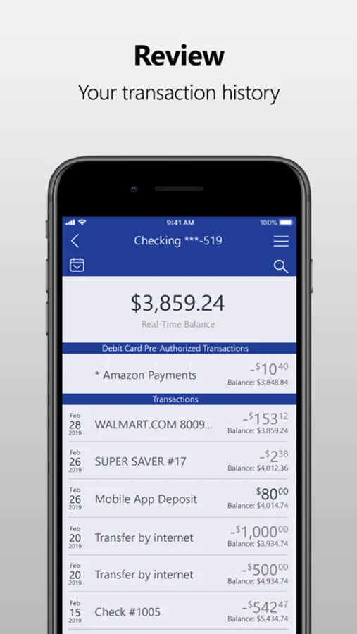Securely access accounts, view recent transactions, transfer money, and deposit checks. View account details, pending transactions, check images and more.