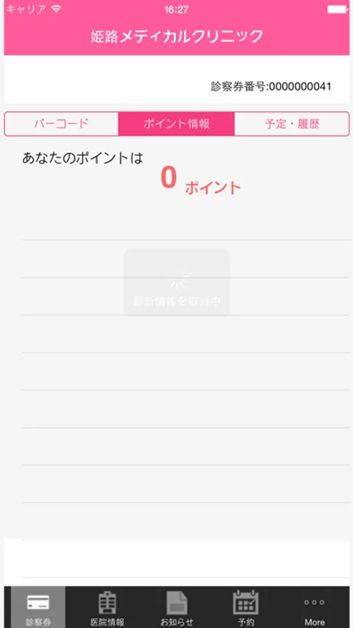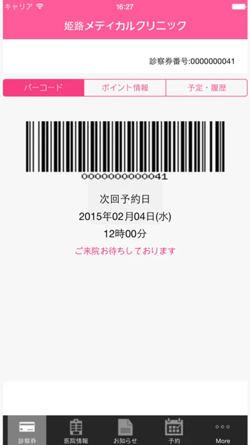 診察券に代わり、自動チェックイン機能、次回来院予定日時や履歴、