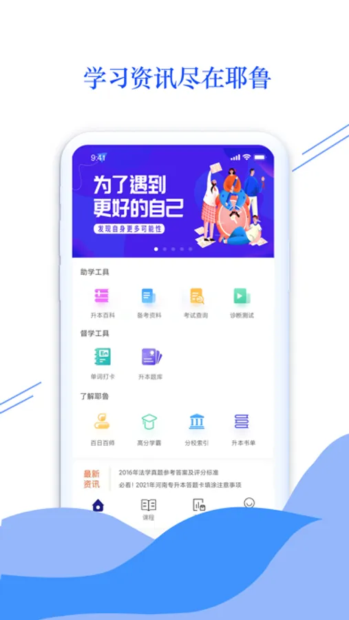 耶鲁专升本App是耶鲁专升本针对准备升本的在校大学生晋升本科所开发的一款手机客户端,其内容包括:升本资讯、升本百科、备考资料、最新活动、在线视频、课程查询、在线报名、图书商城、每日一题、要闻推送等等众多模块,旨在帮助还未升本的在校大学生实现升本梦。“不积跬步,无以至千里”,“温故而知新,可以为师矣”,耶鲁专升本,您身边的升本专家!