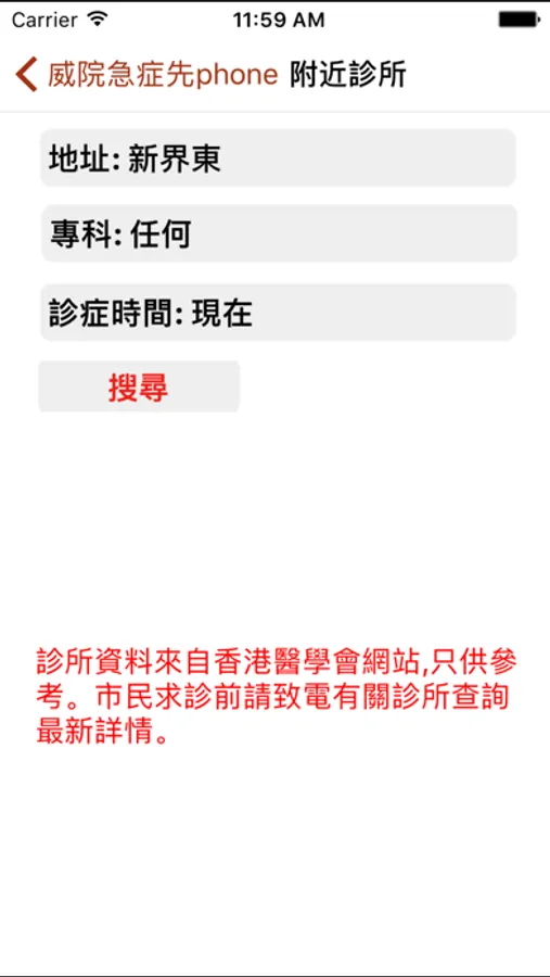 This mobile application provides introduction on the service and triage system of the Prince of Wales Hospital Accident & Emergency Department, current waiting status, and contacts of nearby clinics which are now in service. Patients and the public can make reference in choosing suitable consultation channels.