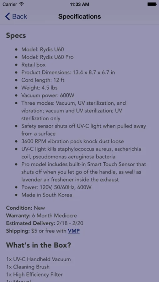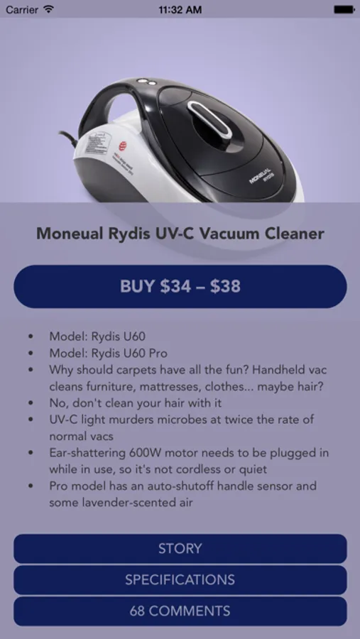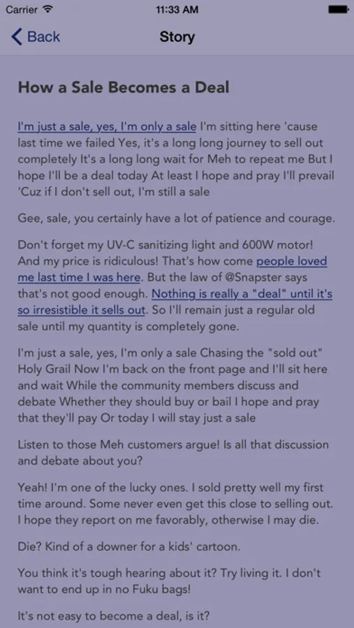 This is a Pretty OK app for viewing mediocre deals from meh.com. Each day a new deal will be shown in the app. Most of the deals will probably be junk, but you can purchase them using the buy button. This will take you to meh.com website to actually purchase.