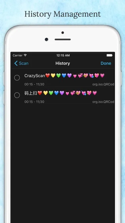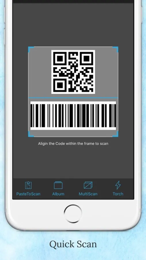 - Quick Actions from the iPhone Home screen: Import a code image from album, Multiscan and Manage History.