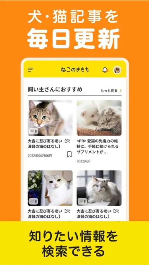 犬だけのコンテンツ、猫だけのコンテンツを分けて表示。「いぬモード」「ねこモード」をタップするだけで気軽に犬・猫の表示を切り替えることができます。