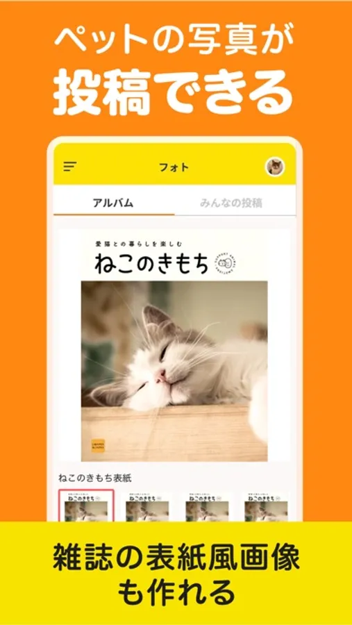 写真を投稿すると月ごとに「アルバム」に整理されます。いつ投稿したかがわかるので、成長を振り返ることができます。さらに、各種スタンプで装飾が可能!「いぬのきもち」「ねこのきもち」の表紙風フレームもありますので、ぜひご利用ください。
