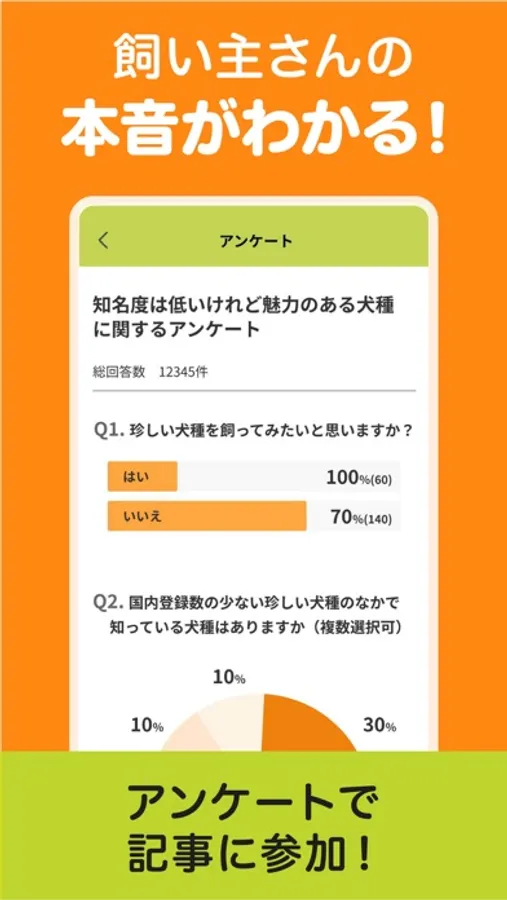 アンケートに参加したり、みんなの回答を閲覧することができます!なかなか聞けない「他の飼い主さんはこういうときどうしている?」「実際はどんな気持ち?」がわかる、大人気機能です。