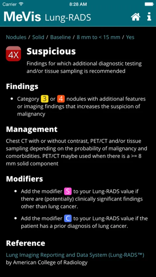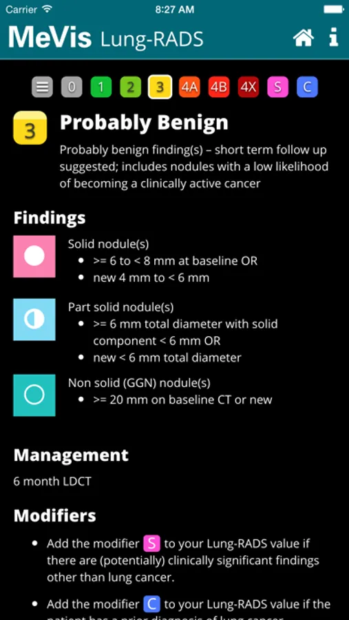√ Reference: Read the details of all assessment categories in your pocket, specifically the specific Lung-RADS assessment categories (0, 1, 2, 3, 4A, 4B, 4X) and modifier S.