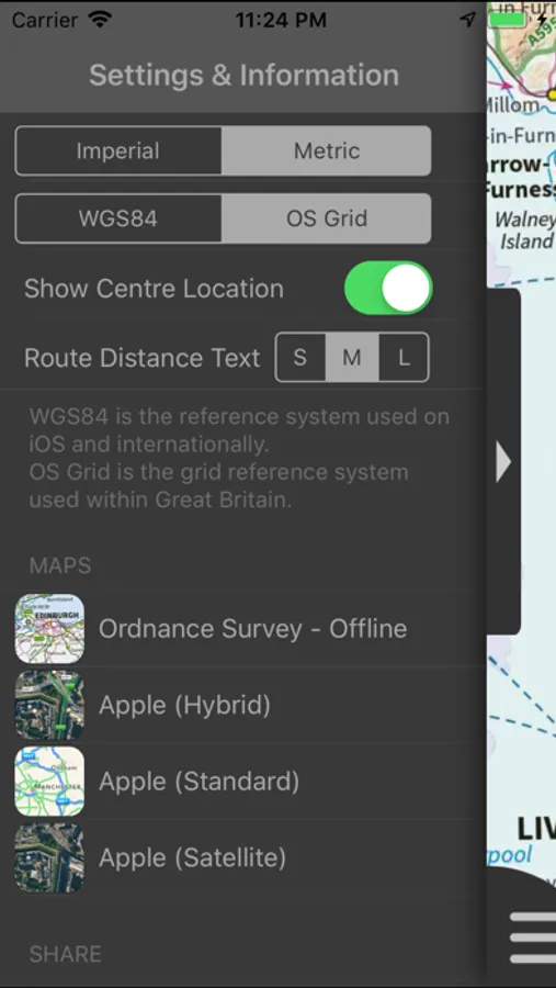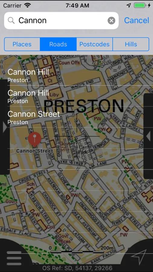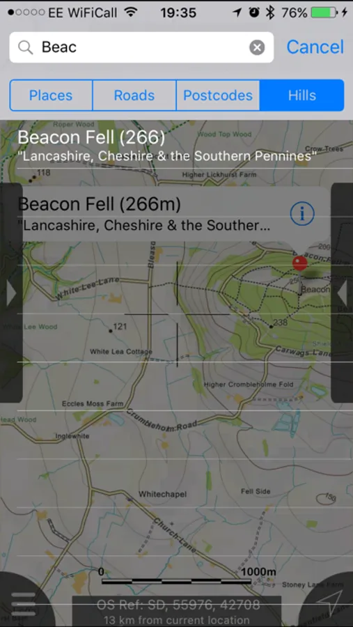 - Offline search functionality with searchable locations (places, roads, post codes and hills). (For the place search a location's latitude and longitude is accurate to 0.1 of a minute of the centre point of the 1x1 km National Grid square in which the name falls)