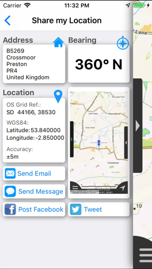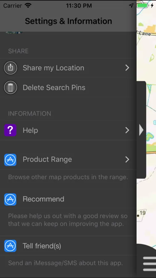 - "Share My Location" allowing users to share an image of their current location and location references. Buttons are provided to share location information by Facebook, Twitter, iMessage/SMS and e-mail