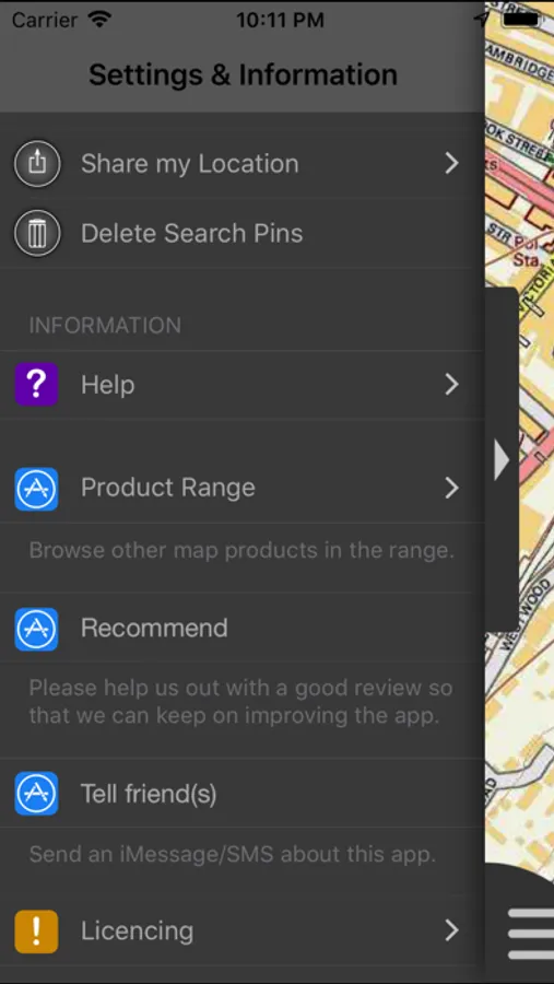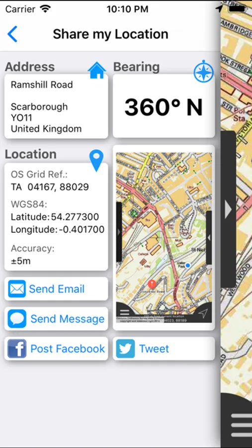 - "Share My Location" allowing users to share an image of their current location and location references. Buttons are provided to share location information by Facebook, Twitter, iMessage/SMS and e-mail