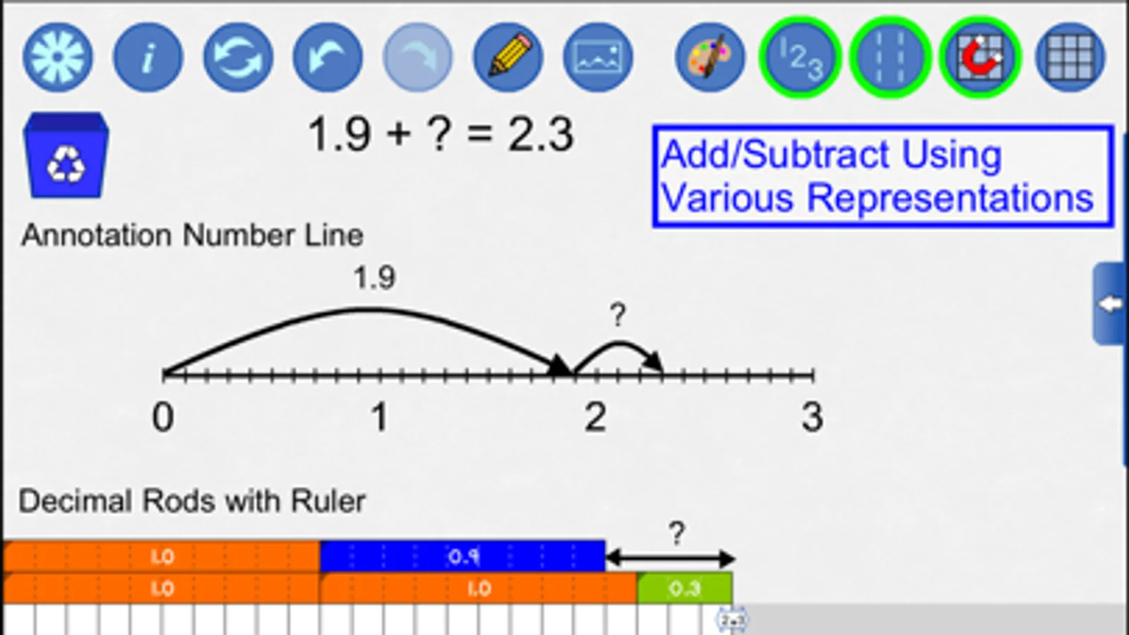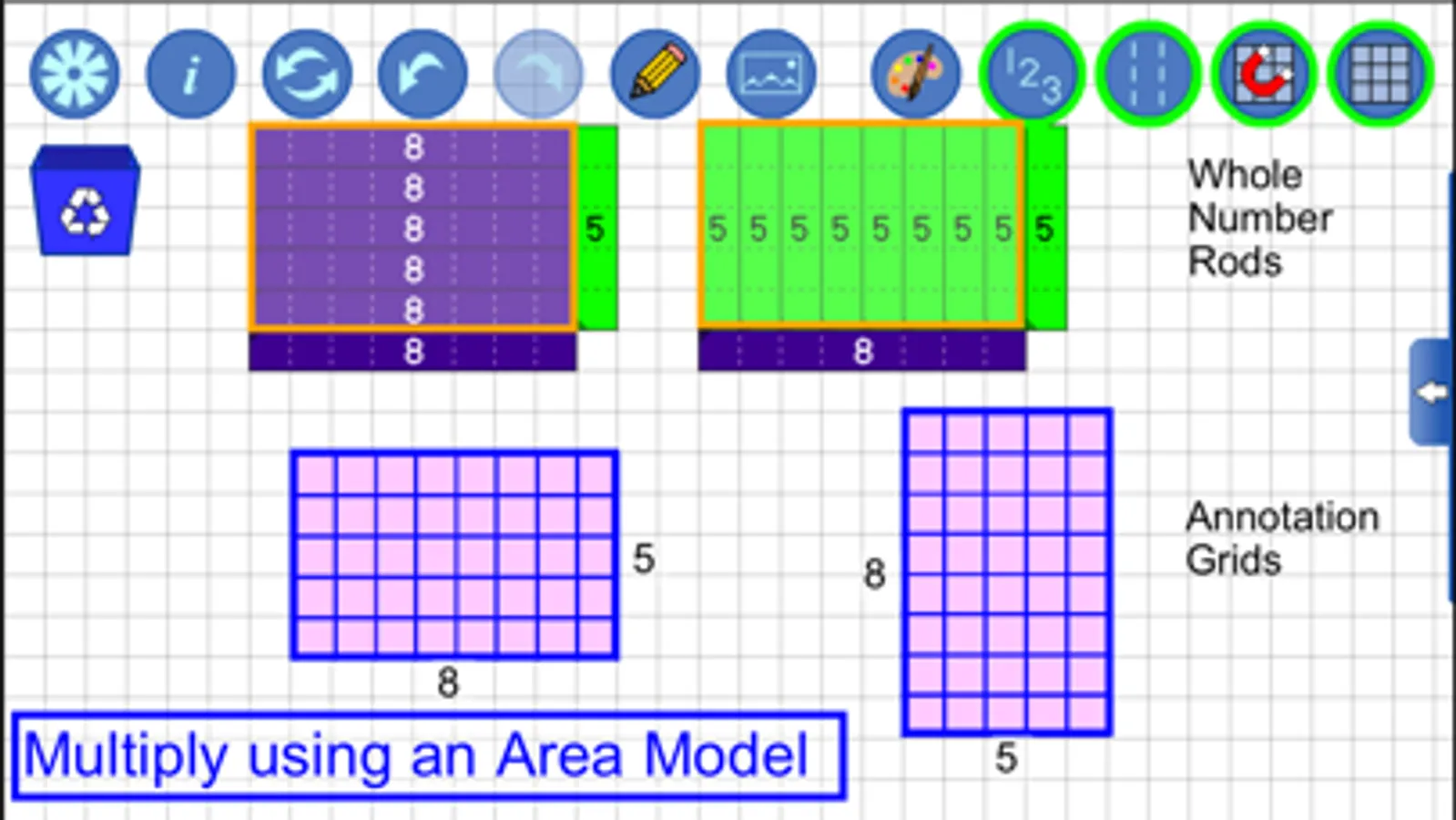Represent, compare, order, and operate on whole numbers, fractions or decimals by dragging rods from the tower into the workspace and manipulating them.