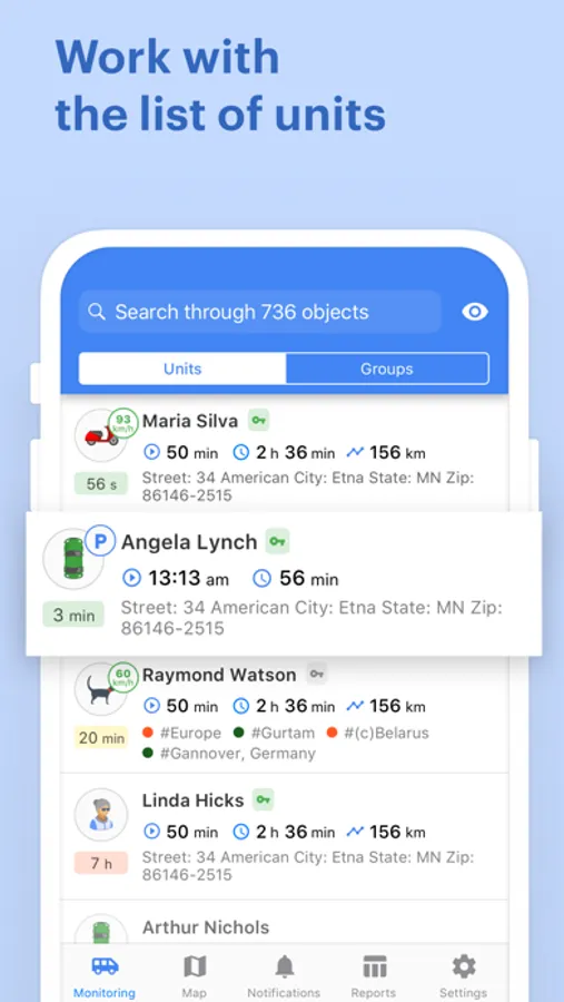 - Unit list management. Get all the necessary information on movement and ignition state, data actuality and unit location in real time.