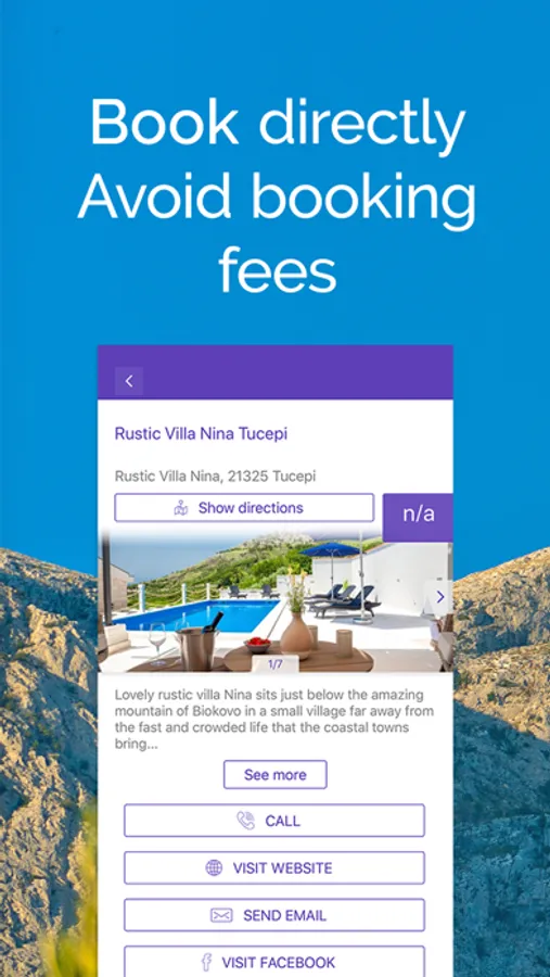 You can call, send an SMS or e-mail, or visit the website or Facebook page of the specific location that you are interested in directly from the application. In this way, you will avoid unnecessary agencies that charge a commission. You can directly book a dinner at your favorite restaurant, an accommodation in the best hotel, or arrange a boat trip around the Mediterranean.