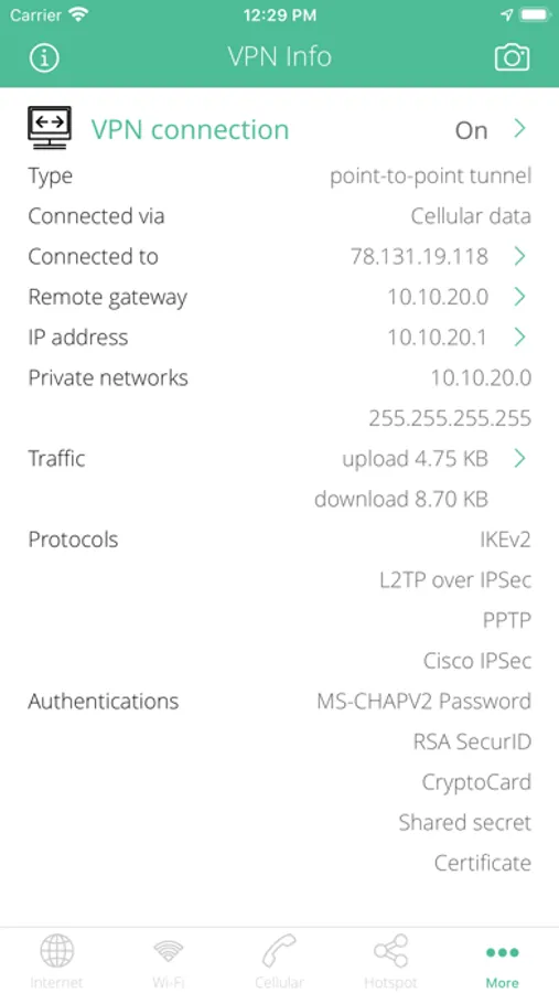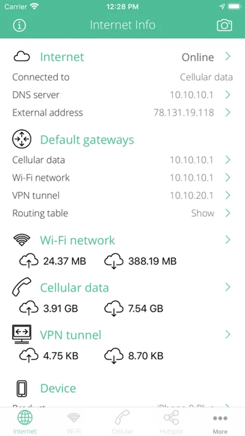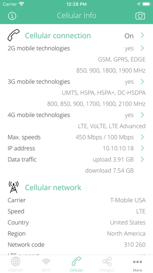 • Show cellular network interface IP address, ISP name, autonomous system name, whois, ping, regional internet registry info.