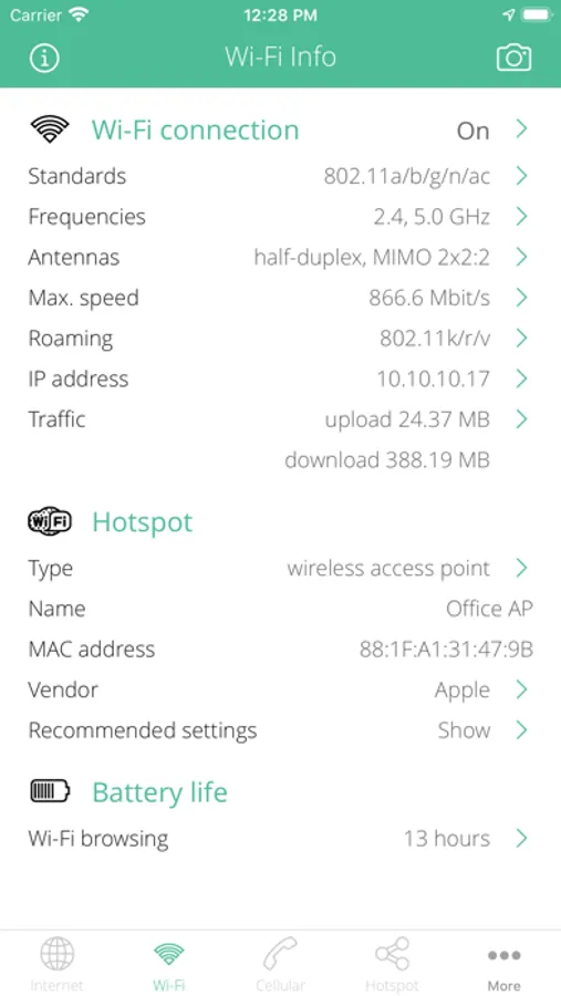• Hotspot SSID, MAC address, IP address and vendor information.