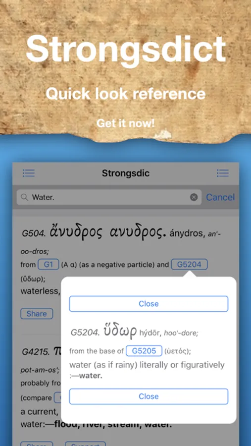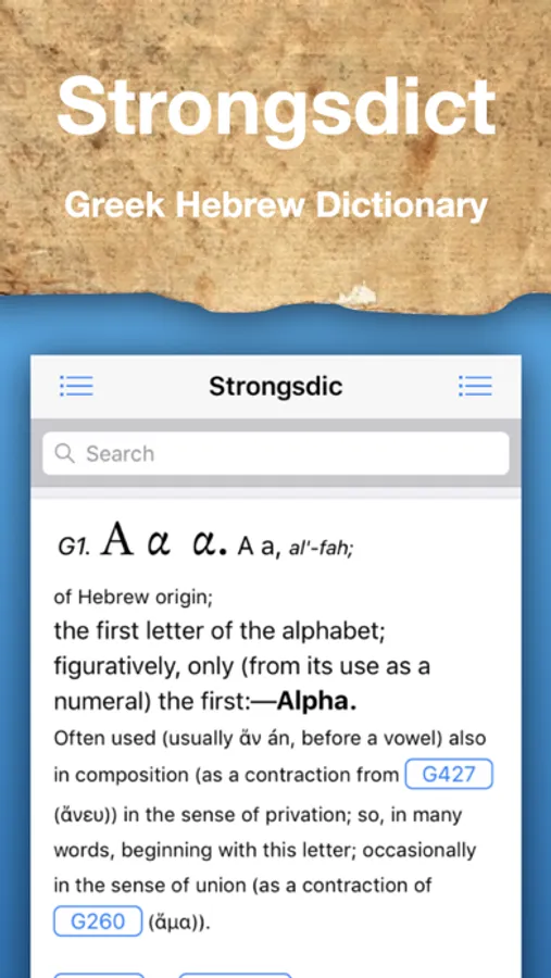 Strongsdict is the full Strong's Dictionary Greek and Hebrew at your fingertips. Greek and Hebrew Strong's dictionary, full featured with a full test search engine. Contains 14197 entries which is the complete Greek and Hebrews Strong's dictionary found in the original book.