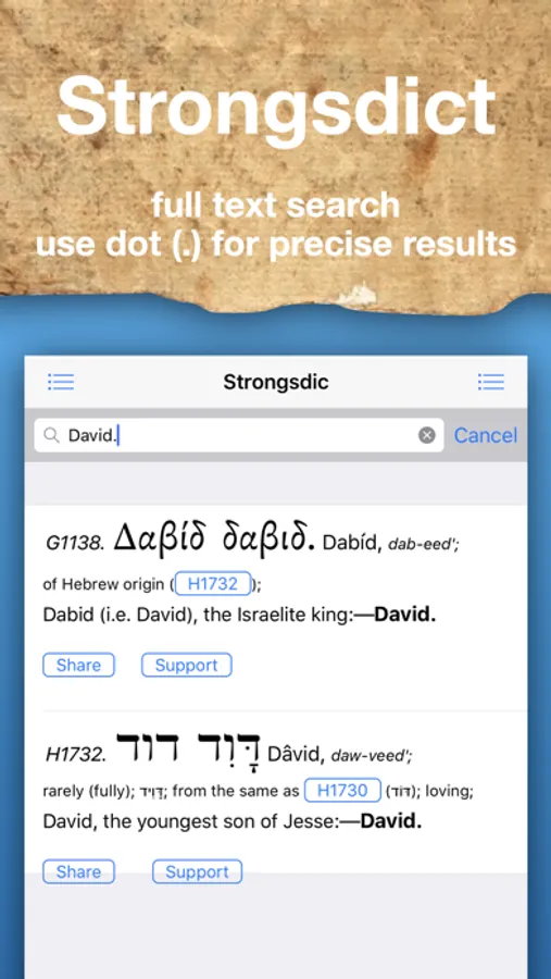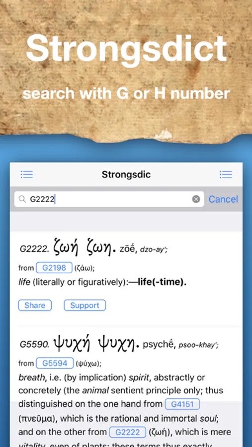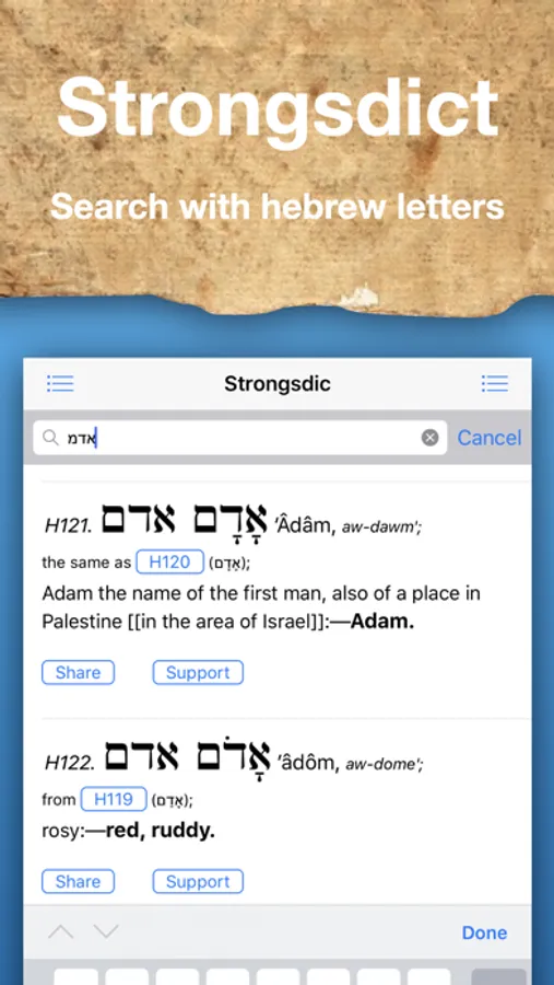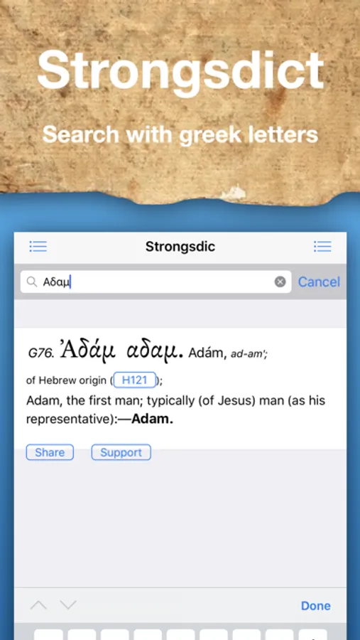 "Been Waiting for this One! ***** (5 of 5 Stars). Let me say I have been searching the web and App Store for a Hebrew/Greek dictionary on and off for over a year that was not contained within a "bible app". And then.... Here she is, just what I was looking for. Upon buying the app I noticed it would not display in landscape mode so I contacted the author and he Quickly corrected the problem and sent me a link to download it. It works great! Since then I have been contacting him with very minor issues I have found, and he has came through on every one of them! He is even adding features like sharing and others I'll let him surprise you with. What I really like is it's ability to search an English, Hebrew or Greek word. You can turn either the Hebrew or Greek dictionary on or off to single out the result. If you know a Strong's number you can search it too. This is a great study tool for anybody wanting to clarify what they're reading. I Highly recommend this app! The features will be added in updates all ready on the way! This app is worth the purchase, as I can't find another that compares. Great work and great customer support!"