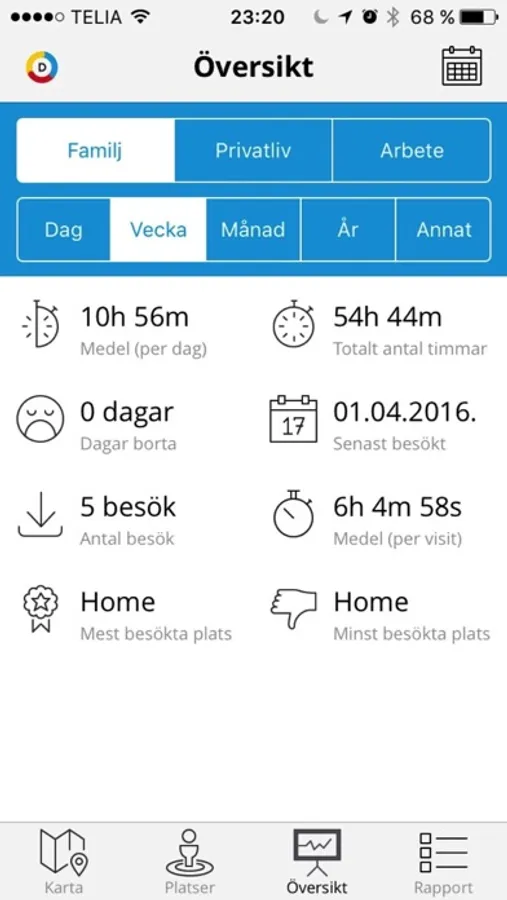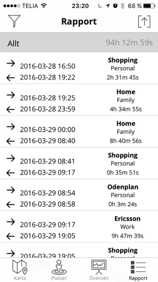 Besides high-level aggregated data that helps you gain overview of your schedule, Diddo can report to the smallest detail - information about each specific visit to your places.