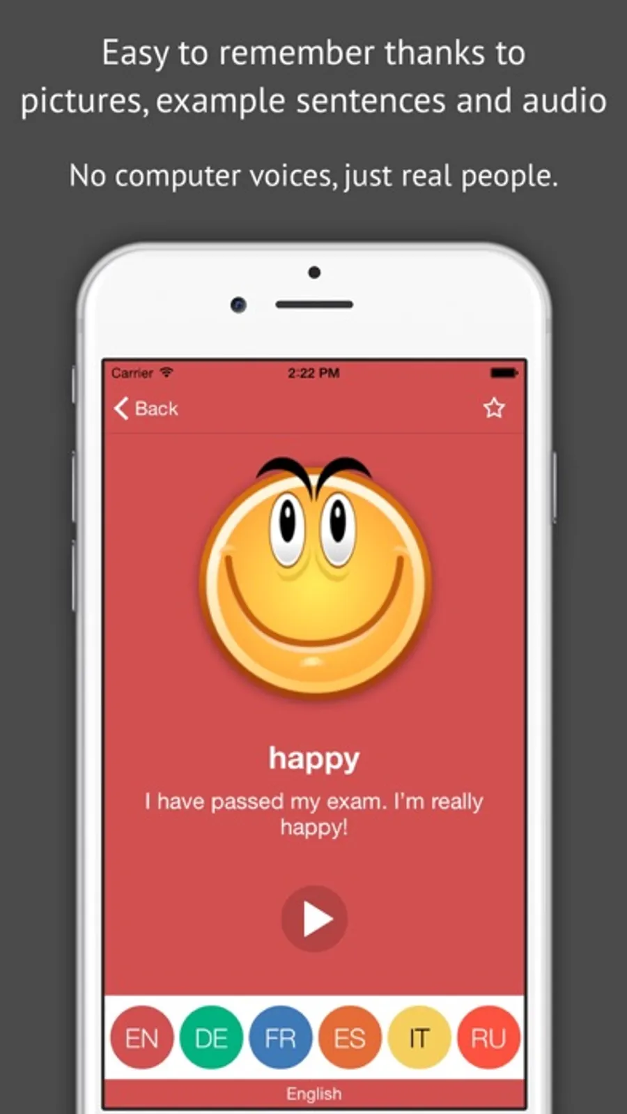The vocabulary is easy to remember thanks to pictures, example sentences and audio that stimulate the senses. No computer voices, just real people.