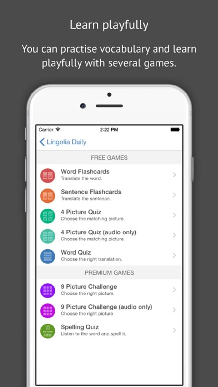 You can practise vocabulary and learn playfully with several games. There are flashcards as well as matching games and a spelling challenge to practise writing. Upon installation of the app, you will have access to 30 words so that you can get started straight away.