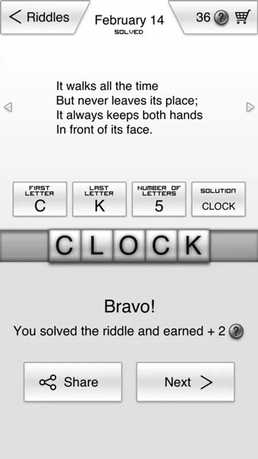 If you get stuck, the hint system will help you. Get the first letter of the solution (1 point); the last letter (2 points); the number of letters (3 points); and after these the solution (4 points). You start with 40 points, get 2 more for every riddle solved, and you can also purchase more points.