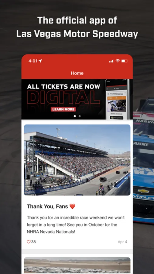 • Take pictures at the events using Fan Cam. Choose from exclusive overlays, share your pictures with LVMS, post to social media and save to your photos.