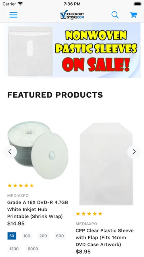 Welcome to the CheckOutStore App! We offer competitive prices on CDR, DVDR, Paper Sleeves, DVD Cases, Jewel Cases, Media Supplies and Accessories.
