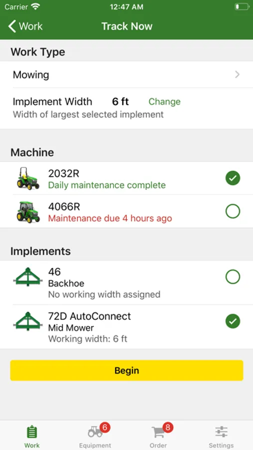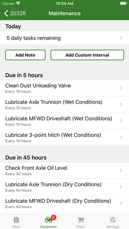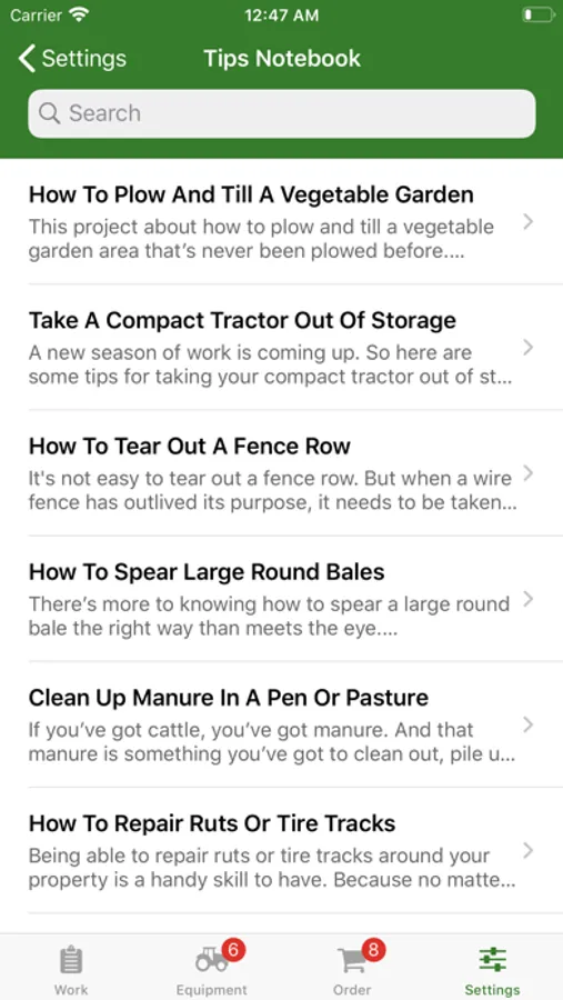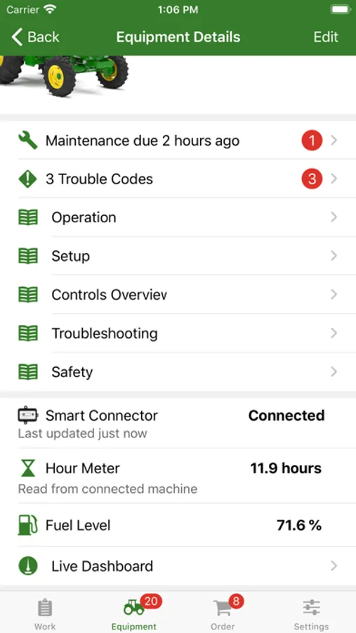 The TractorPlus app from John Deere includes exciting improvements whether you own a 1025R or 9620RX tractor. Quickly identify your equipment using the built-in barcode scanner and unlock a wealth of information and tools that help you use and maintain your equipment more efficiently. View detailed upcoming maintenance recommendations with quick access to instructions from your Operator's Manual or links to relevant tutorial videos. Get fluid capacities and parts information with options to easily purchase via an online shopping cart. Track your engine hours, record your maintenance history, and quickly link to parts diagrams when you need to identify a repair part. For Compact Utility Tractor customers there is also a new option to record and visualize work using your phone's built-in GPS and additional information when looking up diagnostic trouble codes. Browse a list of John Deere and Frontier implements compatible with your small tractor and discover great tutorial videos in the Tips Notebook.
