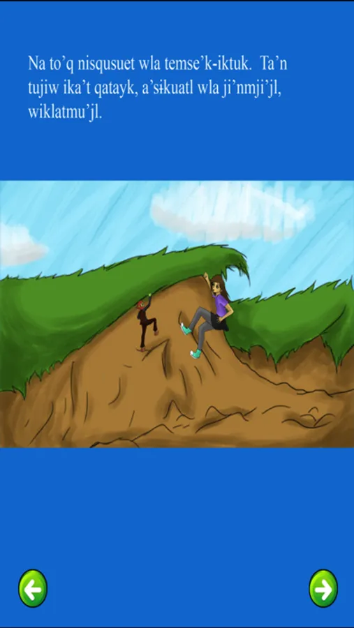 Malia'n aqq Wiklatmu'j is a story about a Mi'kmaw girl's encounter with a character from Mi'kmaw legend.