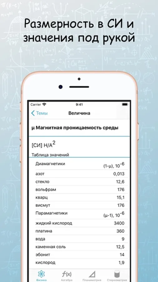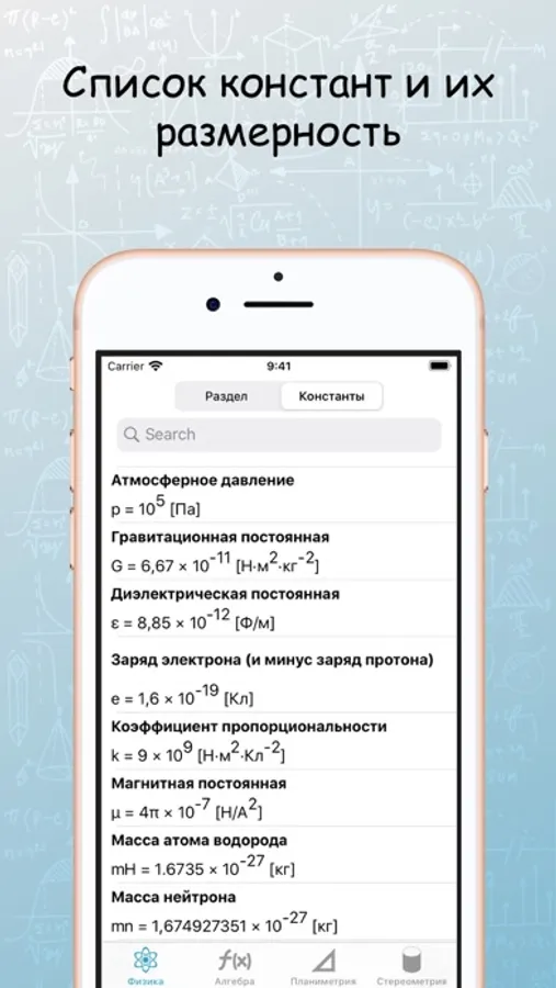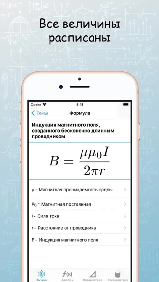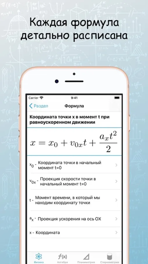 Вы найдете здесь сотни формул по физике, алгебре и геометрии. Каждая величина в формуле тщательно расписана с указанием размерности СИ и вариантами значений в случае констант.