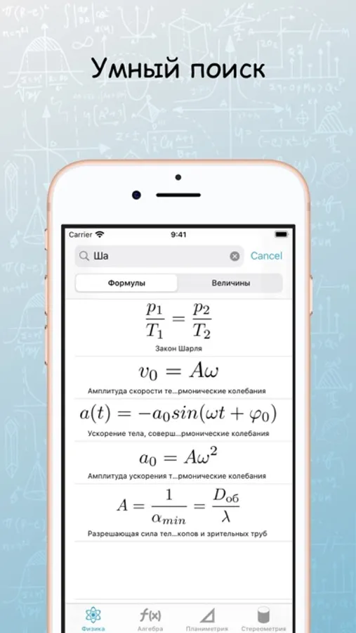 Более того, функция умного поиска поможет Вам найти формулу не только по её названию, но и по названиям и обозначениям величин, которые в нее входят, что бывает как нельзя кстати, когда хочется быстро найти формулы, которые содержат данные в условии величины.