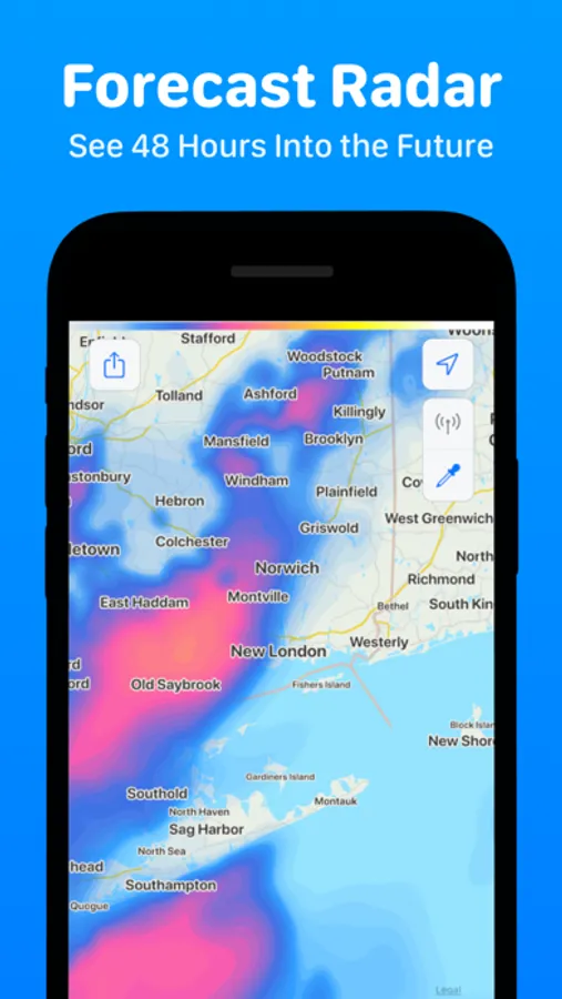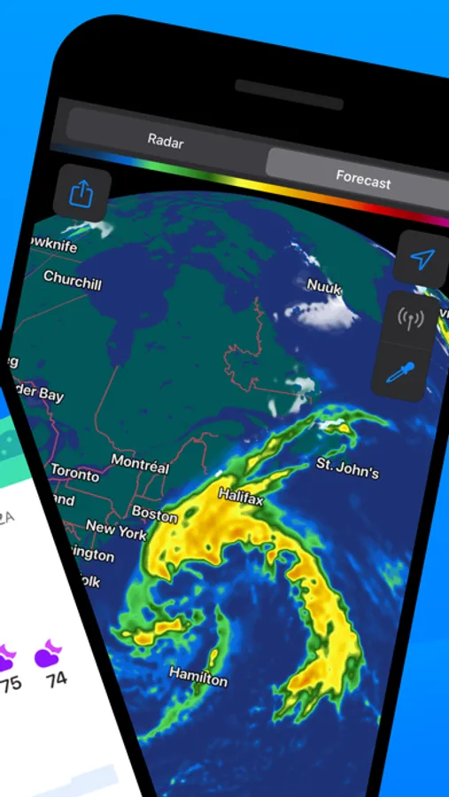 - Weather maps with next-hour radar, individual radar stations, and many different layers (where available)