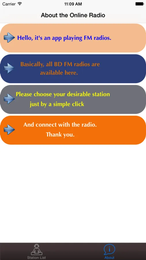 It's an app playing FM radio. Basically, all BD FM radios are available here. Please choose your desirable station just by a simple click and connect with the radio. Thank you.