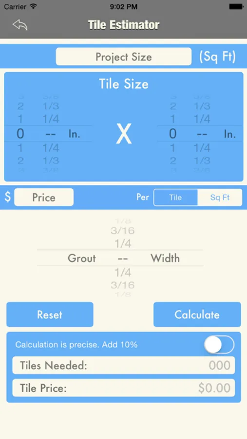 Tile Project Estimator - a simple to use tool for finding the number of tiles needed and cost of your next tile floor, shower or countertop project. Quickly and easily compare the cost of different sizes of tiles and grout configurations.