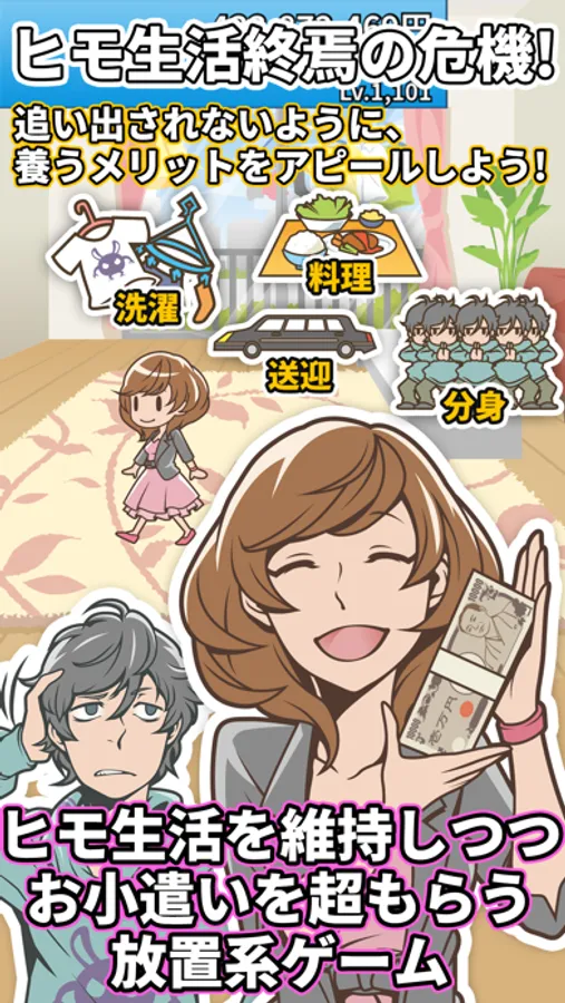 ヒモ男を操り、ヒモ生活を維持する為、養うメリットをアピールしよう!養われながらお小遣いをもらって高等遊民(ニート)になりたい人向け放置系ゲーム