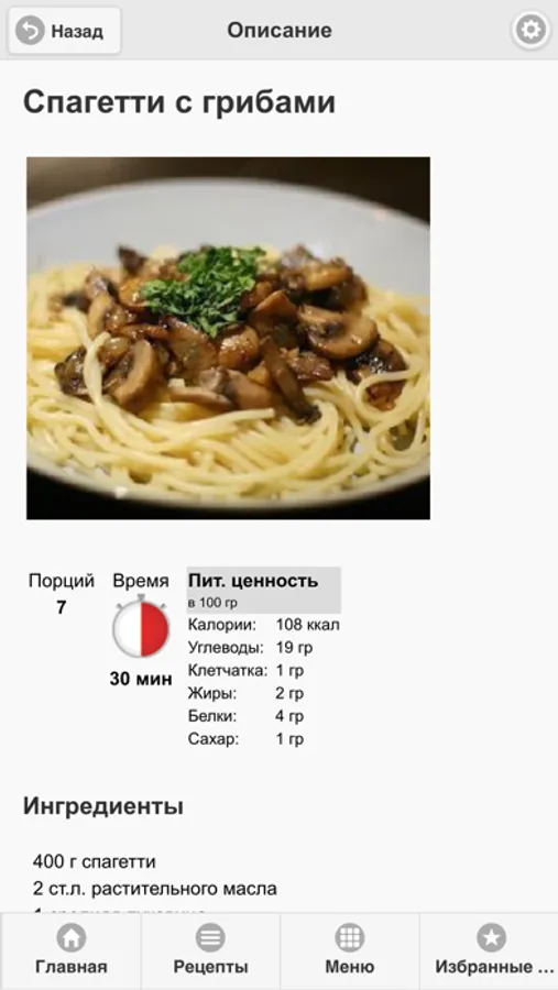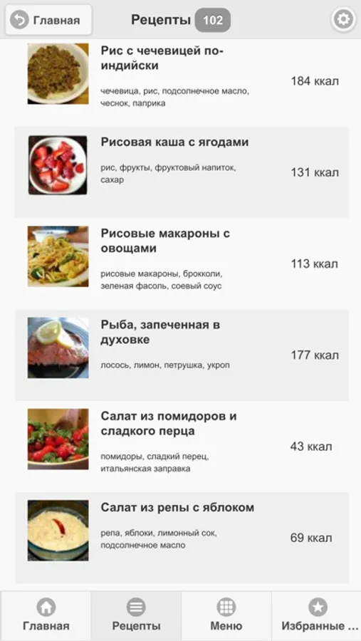 - Просмотреть информацию о калориях и питательных веществах для каждого рецепта.