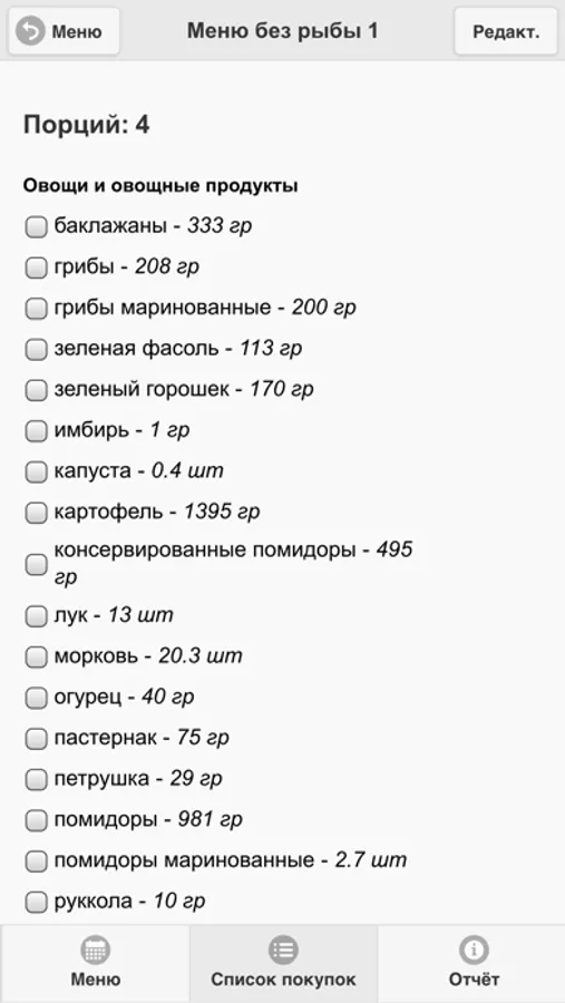 - Просмотреть и отредактировать список покупок для каждого меню.