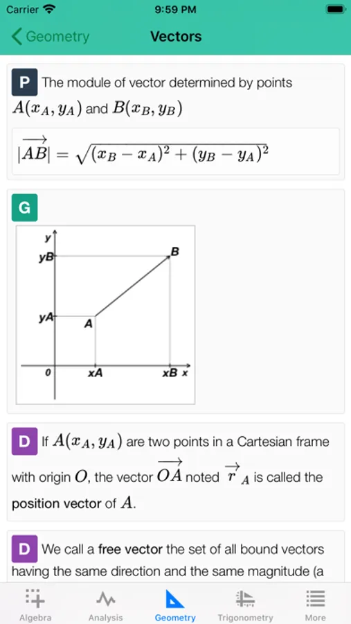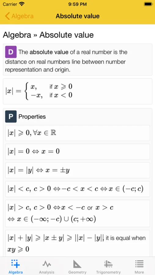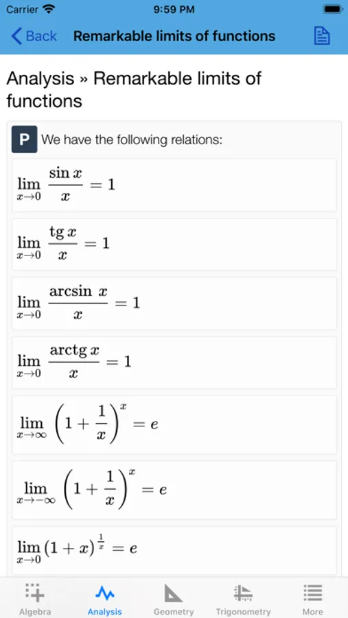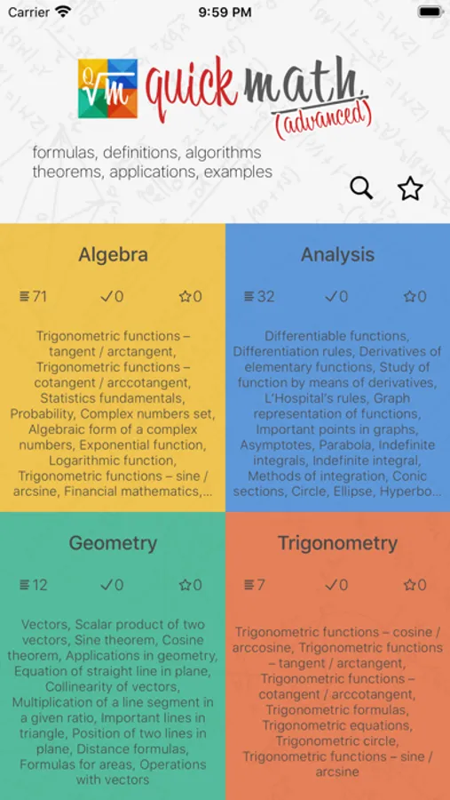 Formulas, definitions, algorithms, theorems, applications, examples is what you can find in Quick Math Advanced. It contains the subjects a student needs to know for his Math exams or homework.