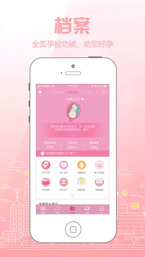 【孕期工具】孕期食谱,体重管理,胎教音乐,胎教故事,产检提醒,血糖管理,胎心监测,胎动计数,宫缩计时,产检清单等。全方位呵护孕妈妈的全孕期。