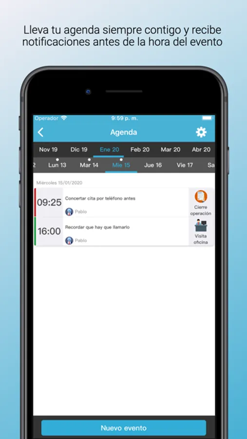 La agenda de tu oficina siempre la llevarás contigo y siempre actualizada, además recibirás notificaciones de cualquier evento que tengas que realizar de forma que nunca perderás una oportunidad de negocio