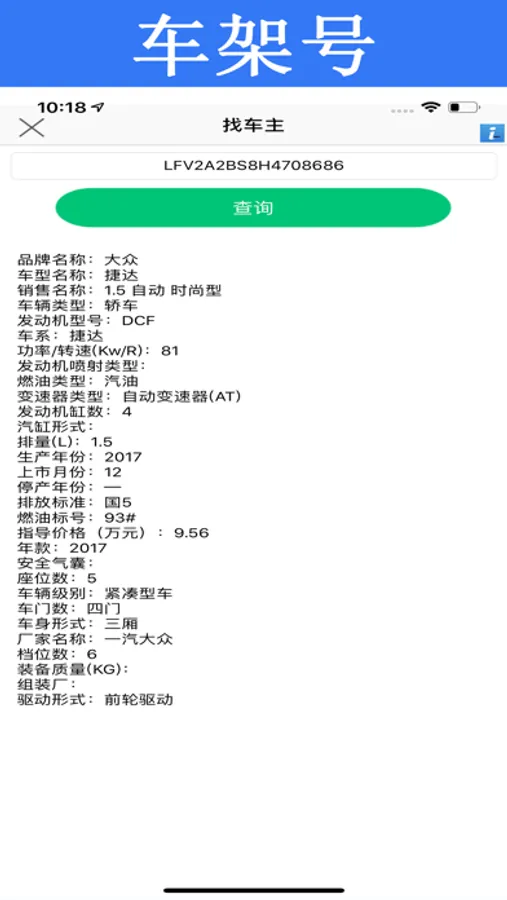 03*输入正确的车架号查询车辆信息,获取对应的品牌名称,车型名称,销售名称,车辆类型,发动机型号,车系,功率/转速(Kw/R),发动机喷射类型,燃油类型,变速器类型,发动机缸数,汽缸形式,排量(L),生产年份,上市月份,停产年份,排放标准,燃油标号,指导价格(万元),年款,安全气囊,座位数,车辆级别,车门数,车身形式,厂家名称,档位数,装备质量(KG),组装厂,驱动形式等信息...