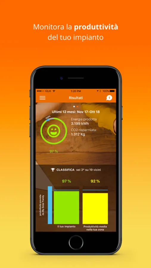 - Confrontare i dati di produzione energetica con quelli vicini a te, per sapere se sei tra i migliori della tua zona (per gli impianti in solo SSP l'app richiederà l'inserimento dell'auto-lettura)