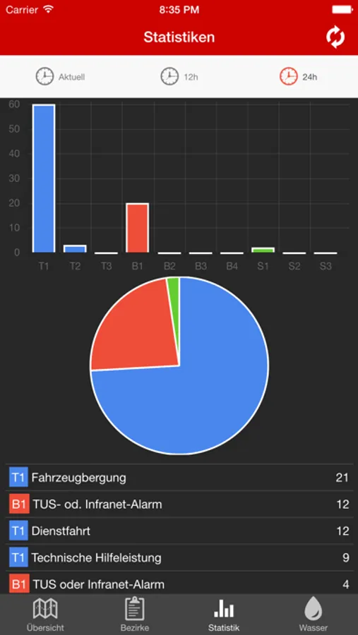 * Einsatzstatistiken mit Diagrammen (Aktuell, 12h, 24h)