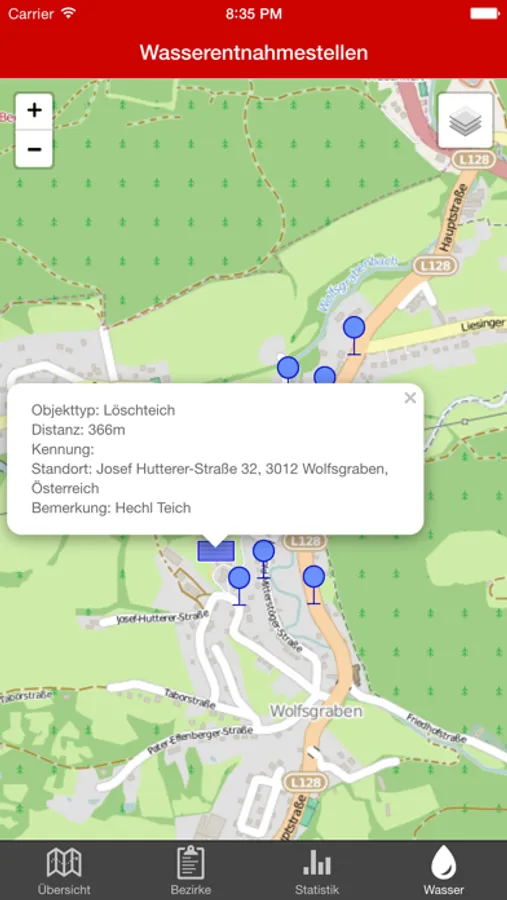 * Detailinformationen pro Wasserentnahmestelle (Objekttyp, Distanz, Kennung, Standort, Bemerkung)