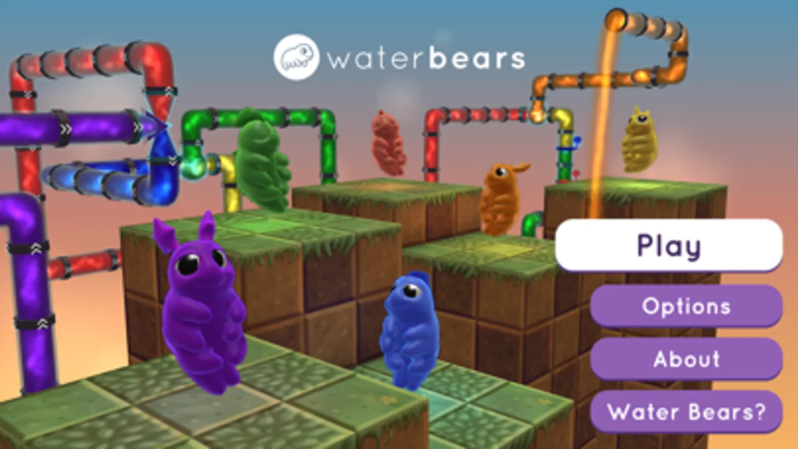 These water bears are sad and dehydrated. They need YOU to help get water to fall on their bubbles. Water bears are picky drinkers, though, so each one will only accept water of a particular color. You'll need to put your pipes in the right place and manipulate the color of the water to make all of the water bears happy.