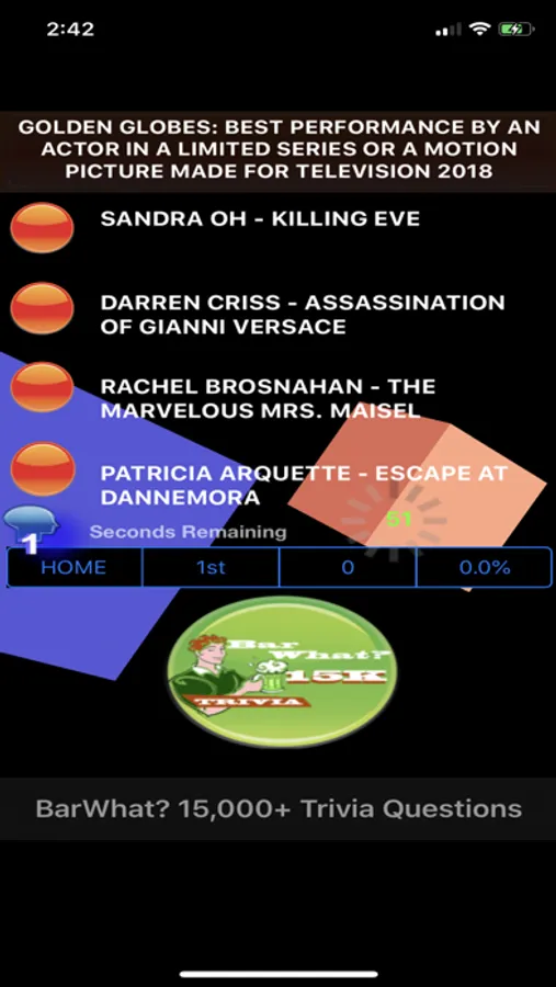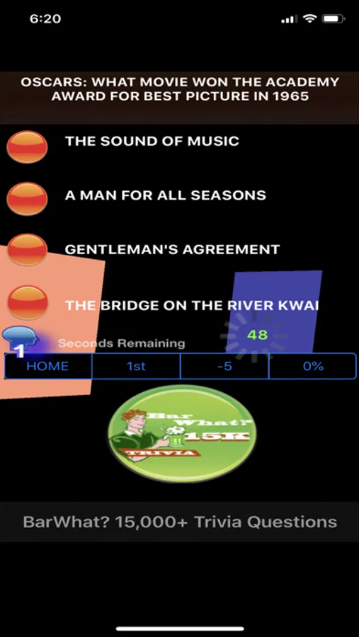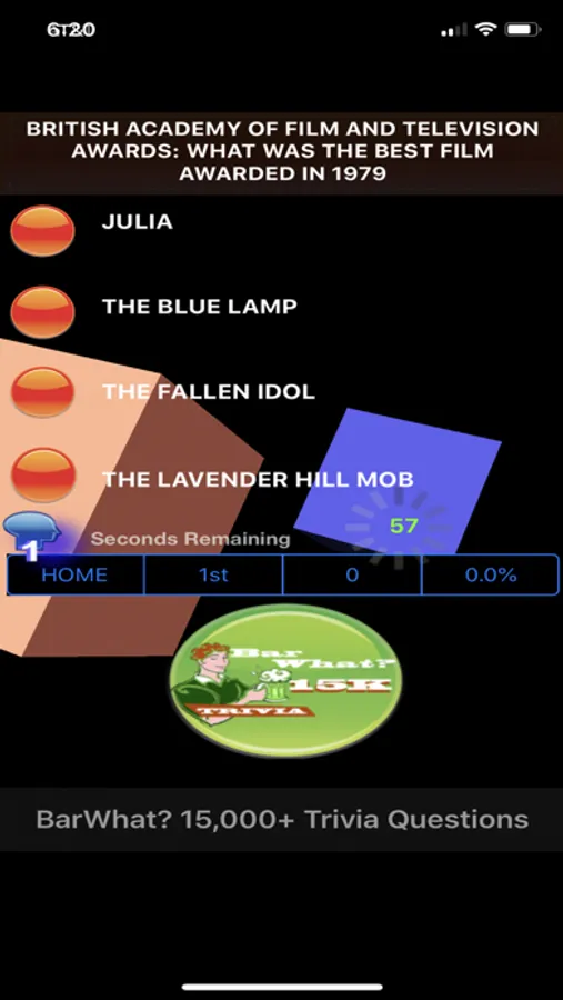 BarWhat? 15000+ Trivia Gameshow Timer Edition is technologically stunning and spectacular. Now by popular request BarWhat? 15000+ has a new and expanded beat-the-clock multiplayer and super randomizer version of this Hollywood guessing gameshow which features Grammy Awards, sports, Oscars, BAFTA, music, math, science, Hollywood stars, zodiac, and geography trivia. BarWhat? 15000+ now sports a sleek and swift automated feature which rotates through over 1000s of unique and fun trivia questions. Highly addictive and fun for all.