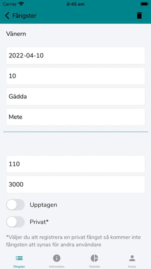 De fångstrapporter Sportfiskarna får in lämnas vidare till forskare och myndigheter för att utvärdera fiskbestånden samt utveckla fiskevården och sportfisket. Inga person- eller kontaktuppgifter lämnas vidare, enbart uppgifter om själva fångsten. Som användare kan du bli kontaktad och tillfrågad om du vill delta i andra undersökningar som rör ditt sportfiske.