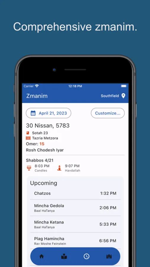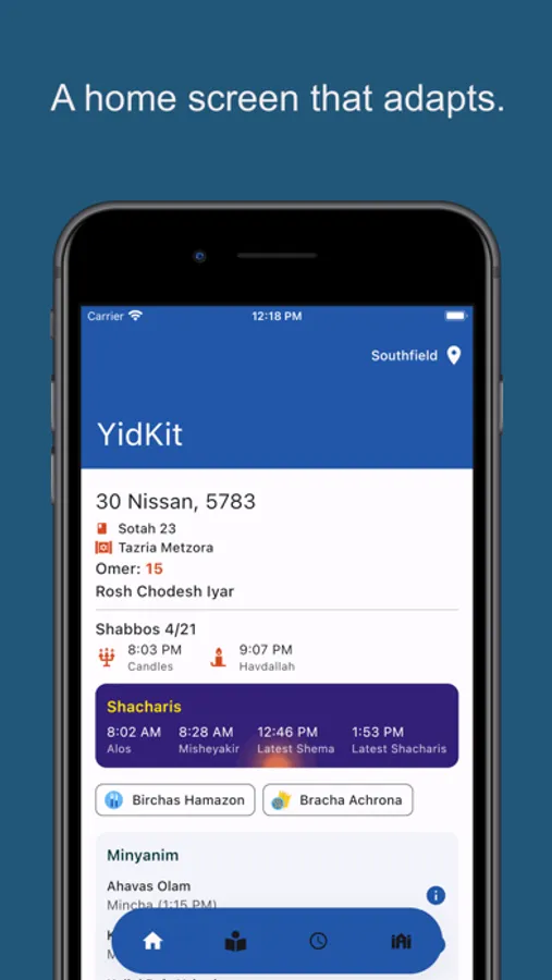 YidKit features an adaptable Home Screen that changes based on the date and time of day.