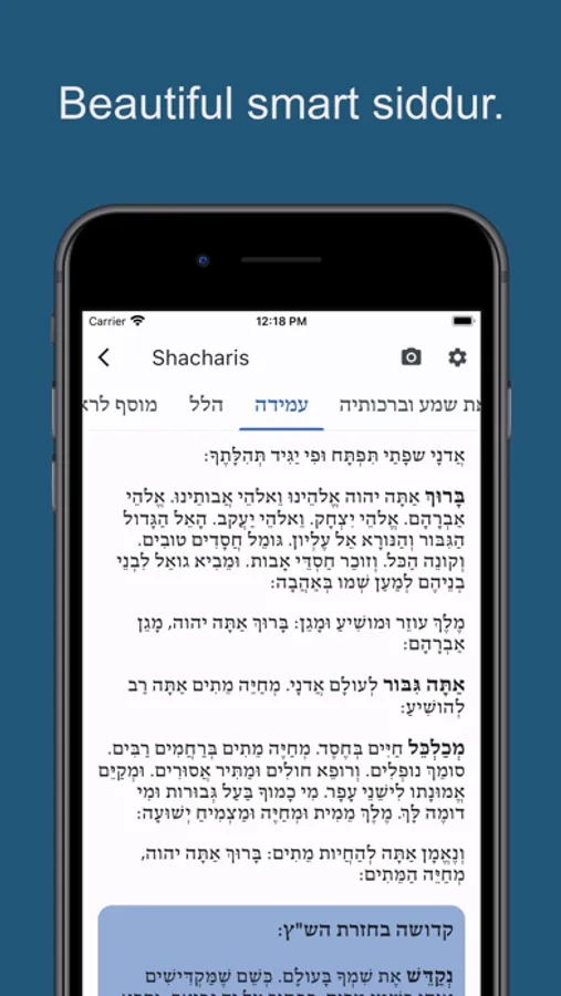 YidKit includes a full Ashkenazi Smart Siddur with Tehilim! The Smart Siddur will automatically show/hide sections of davening depending on the day. The smart siddur has an adjustable font size and features a Tefilin mirror.