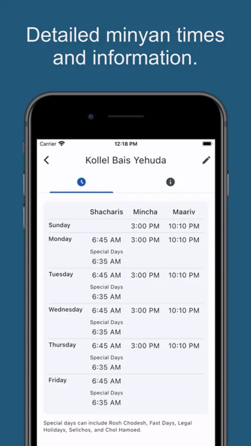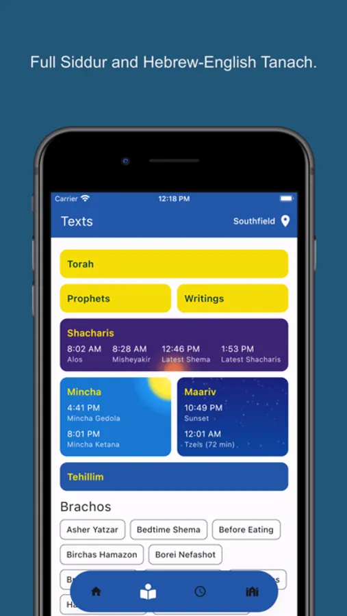 Features: Full smart siddur with Tehilim, Hebrew/English Tanach (Torah, Navi/Prophets, Kituvim/Writings), Zmanim, minyan locator/finder (minyanim)