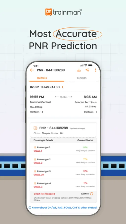 Get the most accurate confirmation chances and Live PNR status prediction for Train Ticket Booking with Trainman.